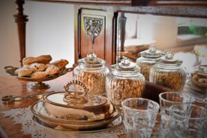 Unseren „Servicetisch“ mit mit Kaffee, Tee, Getränken und Gebäck